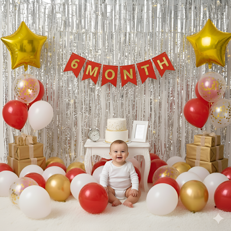 6 Month Birthday Decoration Combo–Half Way to One Birthday Set with "6 MONTH" Banner, Star Foil, Silver Curtains & More- (Pack of 57 Pcs)