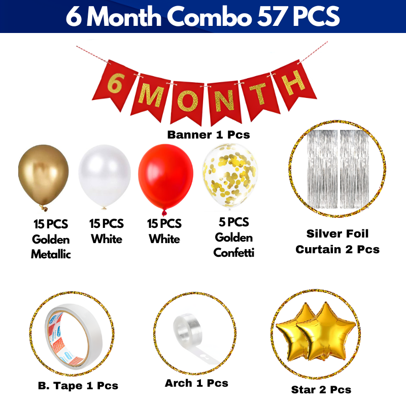 Celebrate your little one’s half year milestone in style with our 6 Month Birthday Decoration Combo. This pack includes a striking “6 MONTH” banner, star foil balloons, shimmering silver curtains, and more for a total of 57 pieces to make your party unforgettable.