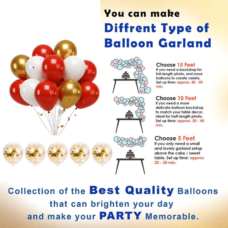 - Balloons Quantity- Golden 15 Pcs, White 15 Pcs & Red 15 Pcs