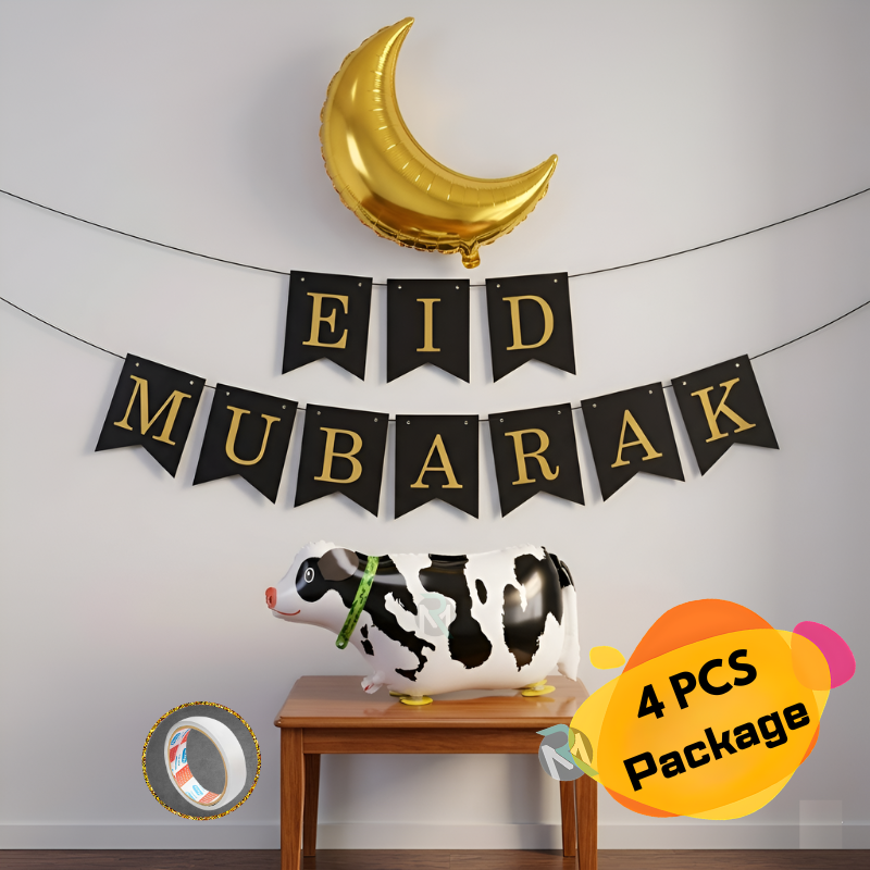 Eid Mubarak Decor Combo for Festive Qurbani Eid Vibes. Celebrate this Qurbani Eid with our exclusive 4-in-1 decoration kit! Perfect for creating a festive atmosphere at home, this combo features high-quality materials and a unique cow-themed foil balloon, making it a hit for kids and adults alike. The package includes 1 Golden Moon Foil Balloon, 1 Cow Shape Foil Balloon, 1 Elegant Black & Gold Eid Mubarak Banner, and 1 Roll of Double-sided Tape. This durable and premium Qurbani Eid decor set comes with everything you need for a quick and professional-looking setup.
