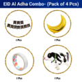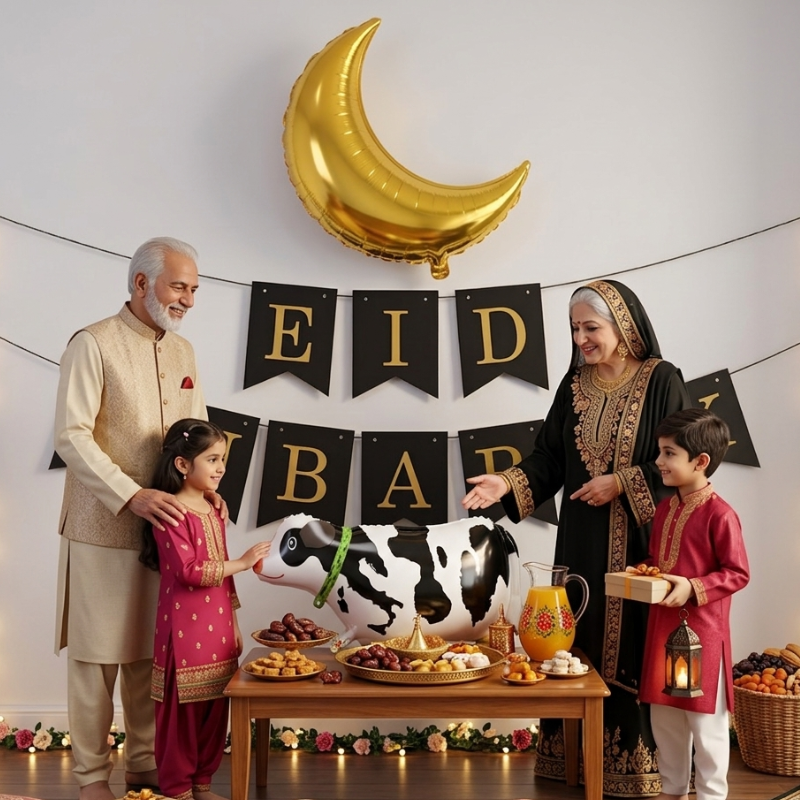Eid Mubarak Decor Combo – Festive Eid-ul-Adha Vibes Decoration Includes Golden Moon Foil, Cow Foil Balloon, Eid Banner & Both-side Tape- (Pack of 4 Pcs)