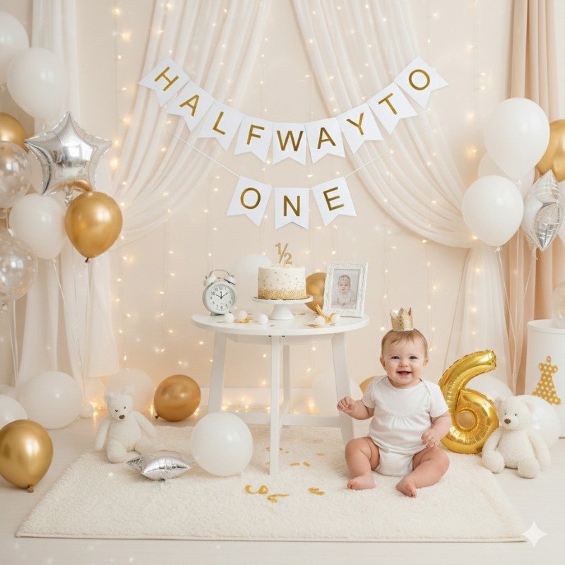 Half Way to One Birthday Decoration Combo | 6-Month Birthday Celebration– Includes Banner, Foil Balloon, Fairy Lights & More- (Pack of 54 Pcs)