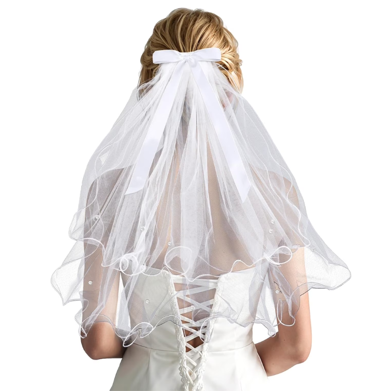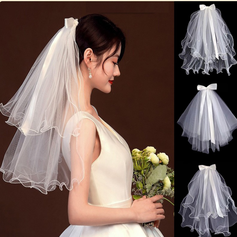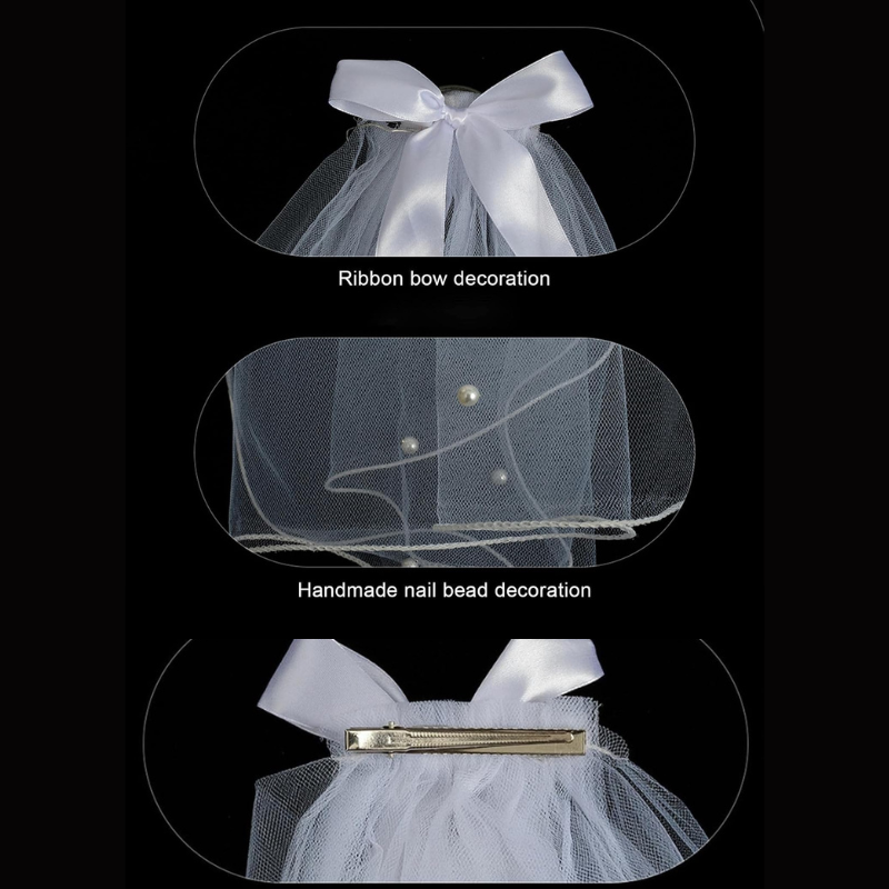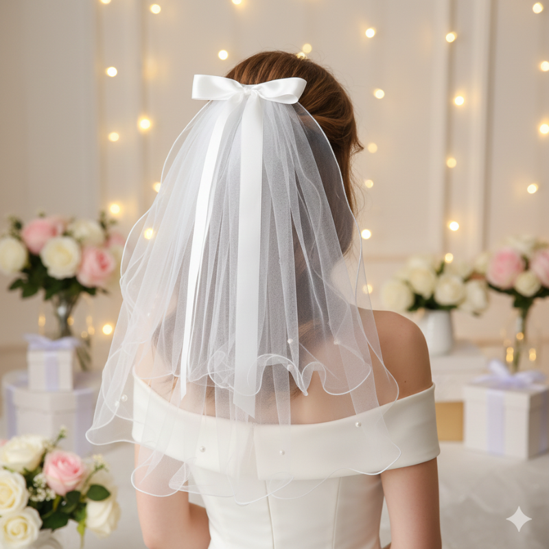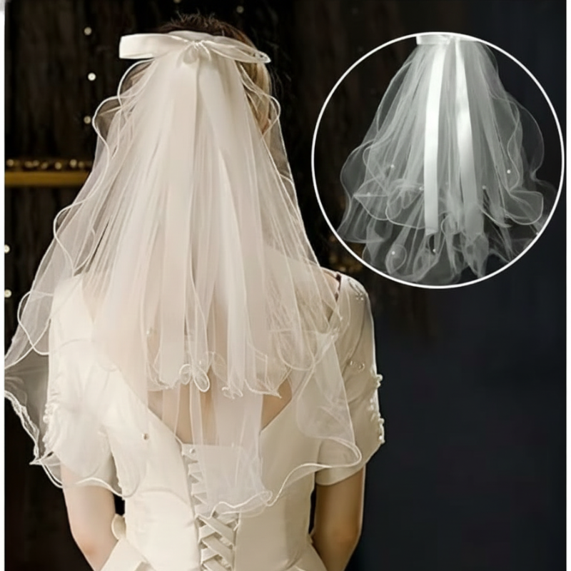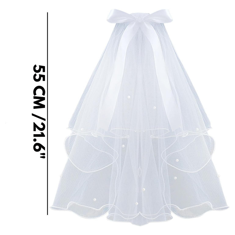 Elevate your bridal look with our Premium Double-Layered Bridal Veil. Adorned with a beautiful pearl beaded butterfly bow, this elegant 55cm hair clip style veil adds a touch of glamour to your special day.